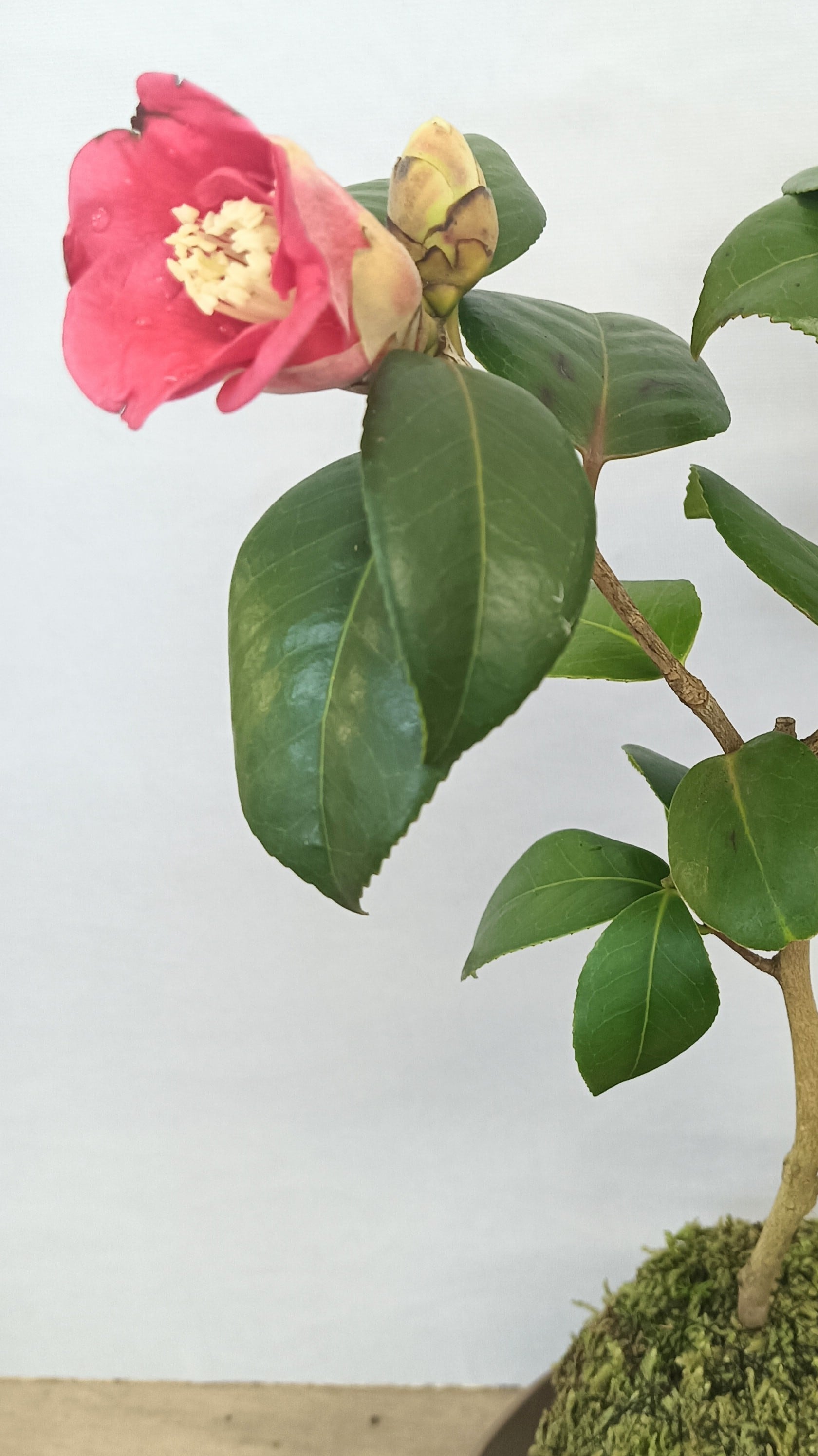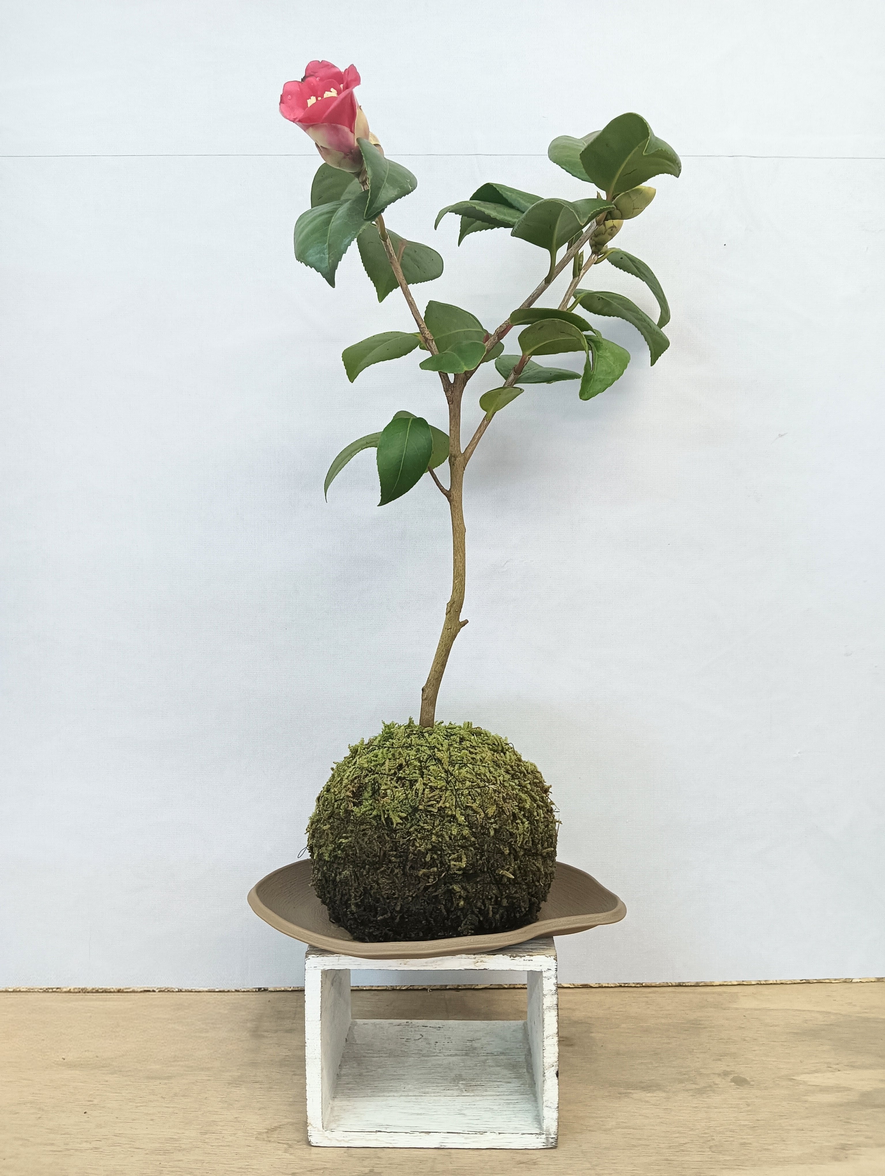 椿は新春に美しい花を咲かせ、季節感を楽しめる人気の苔玉です。